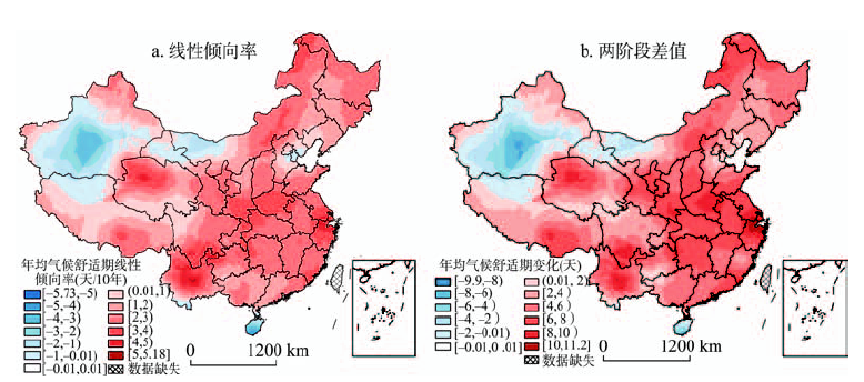 中国大陆1961-2010年间气候舒适期的空间格局及其演变 |