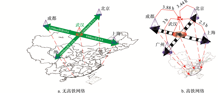 | 图2 高铁网络下武汉到北京,上海,广州和成都四大城市的可达性变化示意图 |