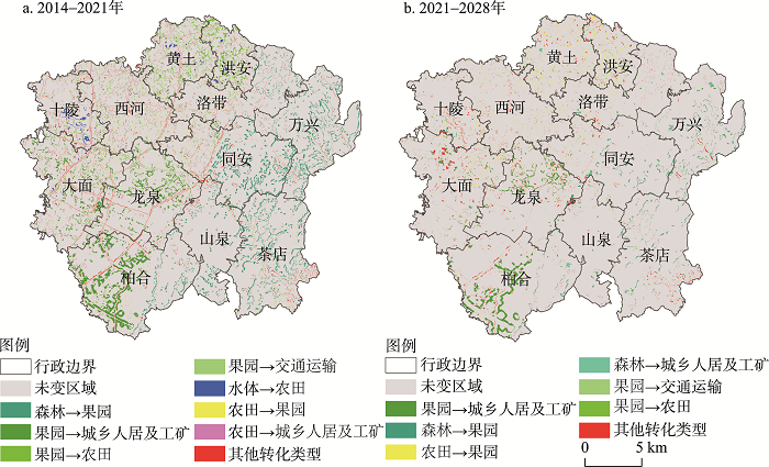 | Fig. 7 Spatial distribution of major landscape changes during 2014-2021 (a) and 2021-2028 (b) in the study area |