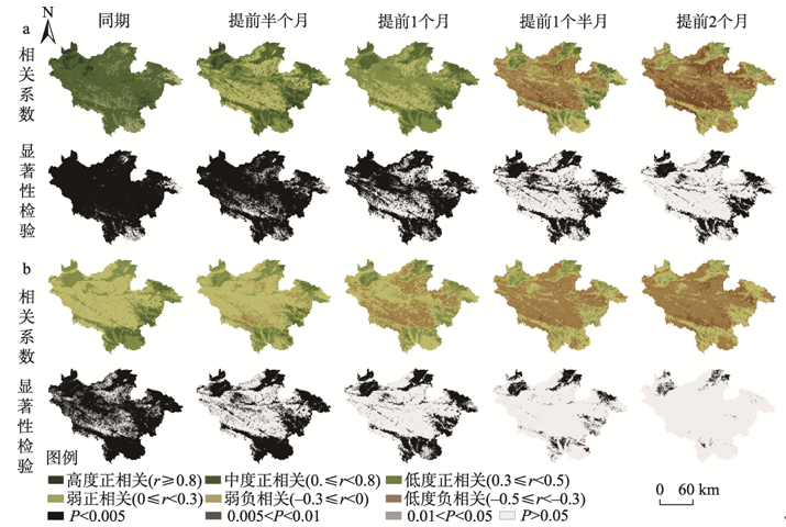 | 图9 伏牛山地区生长季植被EVI与气温(a)和降水(b)相关系数及显著性检验的空间分布 |