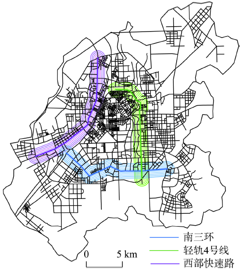| 图7 轻轨、快速路、主干路位置示意图 |