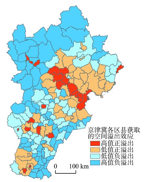 京津冀各县域获取的空间溢出效应与发出的空间溢出效应具有相似的特征。① 获取的两种空间溢出效应县域的数量上,正溢出效应的县域有72个,而负溢出效应的县域有96个,仍以负溢出效应为主导。② 获取负溢出效应的县域主要分布在河北省的西北部和东南部,以北京和天津为双核的京津唐地区是获得正溢出面积最大的区域。③ 受空间衰减规律的影响,获得低值正溢出效应的地区分布在城市核心地区的外围,向外依次为获得低值负溢出效应和高值负溢出效应的县域。④ 地级以上城市的市辖区依靠强大的集聚经济效应,吸引资本、人才、技术等生产要素流向该地区,获得了自身发展的动力,表现为获取了高值正溢出效应,同时通过与外围地区建立产业联系,对邻接地区也释放了普遍的正溢出效应。