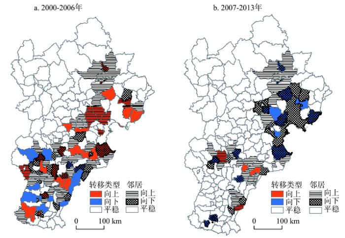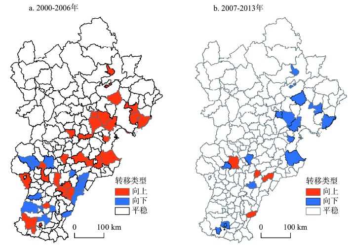 使用Conley-Ligon修正模型计算了京津冀各区县对外释放以及从外部获取的溢出效应并分析了其空间格局的特征。之后,应用传统马尔可夫链法分析了不同经济水平类型县域在研究时段内发生转移的概率分布规律,而空间马尔可夫链分析则证实了京津冀地区间溢出效应的存在,且经济发展受邻接县域经济发展状况的影响。下面,本文将以上两部分的结论相结合,通过京津冀县域经济水平类型发生转变的空间格局特征分析验证溢出效应对经济水平类型变化的影响。