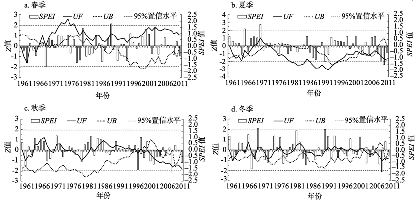 Fig.4 Seasonal SPEI time series and Mann-Kendall abrupt test