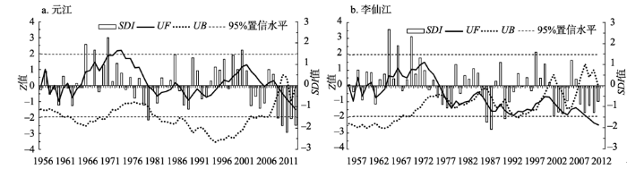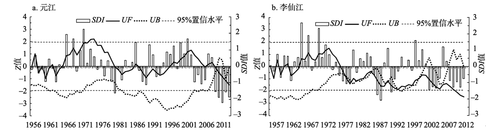 Fig.7 Annual SDI time series and Mann-Kendall abrupt test for the Yuanjiang River (a) and the Lixianjiang River (b)