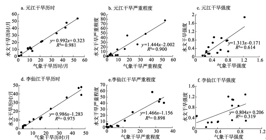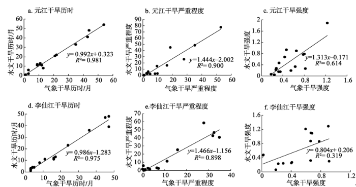 图9 元江和李仙江典型气象干旱和水文干旱事件的历时、严重程度和强度的相关性
