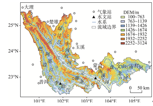 红河是东南亚重要的国际河流,主要流经中国、越南和老挝三国(图1)。中国境内干流全长677 km,流域面积约7.6×104 km2。流域属于典型的亚热带季风气候,具有明显的干湿季特征,5-10月为湿季,降水量占全年的85%以上;11月-次年4月为干季,降水量不及15%。中国境内流域降水量时空分布不均,从700~3200 mm不等,大部地区介于1000~1600 mm。降水空间分布由南向北递减,河谷地区降水稀少,山区降水丰富。降水是河川径流补给的主要来源,受降水变化的影响,径流年内分配极不均匀。汛期径流量占年径流量的80%以上,枯水期径流量小于年径流量的20%。受气候变化的影响,近年来极端水文事件频发,给流域社会经济造成巨大损失。2009-2012年流域遭遇4年连续严重干旱,导致红河源头出现断流现象,越南河内的红河水位则创下了1902年以来的最低记录,引发了下游国家的关注。