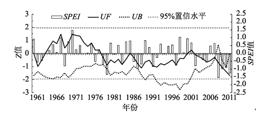Fig.3 Annual SPEI time series and Mann-Kendall abrupt test