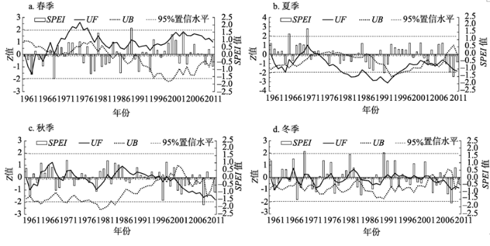 图4为不同季节红河流域SPEI指数的年际变化及其M-K检验。红河流域春、夏、秋、冬季SPEI指数的Z值分别为1.05、-1.72、-1.71和-0.85,未能通过0.05的显著性水平检验,说明变化趋势并不显著。其中夏、秋两季SPEI值下降的变率较大,平均每10年分别下降0.116和0.117。由图4a可知,自1961年以来,春季SPEI指数呈波动上升,说明春季有变湿的趋势。在0.05显著性水平的临界线之间,UF和UB曲线相交于1967年,春季经历了由干变湿的转变。由图4b可知,1960s夏季是相对湿润时期,1974年由湿向干转变,之后UF值一直小于0,说明夏季呈现出变干的态势。由图4c可知,在0.05显著性水平的临界线之间,UF和UB曲线相交于2000年,说明从2000年开始秋季有干旱化的趋势。由图4d可知,2003年以前冬季UF值在0附近上下波动,2003年开始UF值一直小于0,说明从2003年开始冬季有变干的趋势。综上所述,红河流域春季表现出变湿的趋势,夏、秋、冬季表现出变干的趋势,但上述趋势均未通过0.05的显著性水平检验,说明变湿/干趋势不显著。