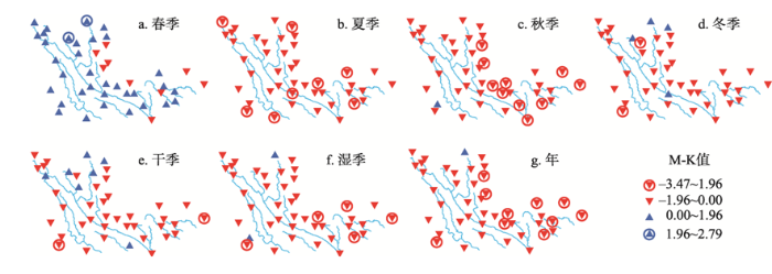 分别利用3、6和12个月尺度的SPEI指数来表示季节、干湿季和年尺度的干旱状况,并进行M-K趋势检验(图5)。从季节变化来看,春季普遍呈现出湿润化趋势(图5a),湿润化站点比例为79%,但仅有5%站点变化显著,主要分布在流域北部;干旱化的站点主要分布在流域东部地区。夏、秋、冬三季SPEI值变化整体以干旱化为主,干旱化显著站点分别占19%、23%和5%(图5b-5d)。由图5e和图5f可知,干季(11月-次年4月)大部分地区的SPEI值呈下降的趋势,但是趋势并不显著;湿季(5-10月)93%站点的SPEI值表现出下降的趋势,其中12%站点趋势显著。红河流域年尺度SPEI值变化普遍呈现出干旱化趋势,其中23%站点趋势显著,主要分布于流域东部地区及东南地区(图5g)。以上结果与王东等(2014)的研究结论“1960-2012年西南地区夏秋冬三季干旱化趋势明显、干旱化区域面积较大”相一致。