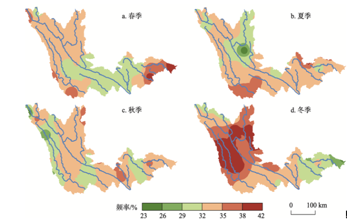 图6为红河流域1961-2012年不同季节干旱频率的空间分布。由于受印度洋季风和东亚季风交汇影响,加之纵向岭谷地形的作用,使流域降水和气温分布具有局域性,从而导致不同季节干旱频率空间分布差异较大。春季干旱发生的频率在26.9%~42.3%之间,李仙江、元江上游以及南利河春旱频率较高,藤条江、元江下游和南溪河等地的春旱频率较低(图6a)。夏季干旱发生频率在23.1%~38.5%之间,夏旱高发区为流域南部地区,绿汁江等地频率较低(图6b)。秋季干旱发生频率在23.1%~40.4%之间,李仙江中下游、元江中下游及河南利河等地频率相对较高(图6c)。冬季干旱发生频率相对最高,介于25.5%~43.1%之间,除了盘龙河、南利河部分地区外,流域大部分地区冬季干旱发生频率都较高(图6d)。