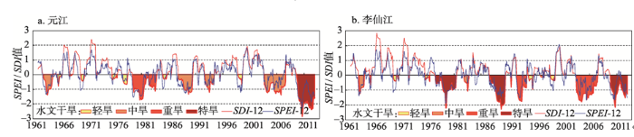 Fig.8 Comparison of SDI-12 and SPEI-12 variations for the Yuanjiang River (a) and the Lixianjiang River (b)
