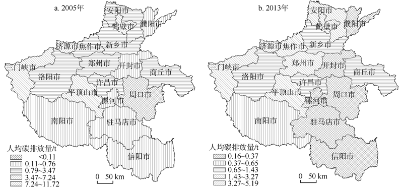 | 图4 2005(a)、2013年(b)河南省人均碳排放总量的空间格局 |