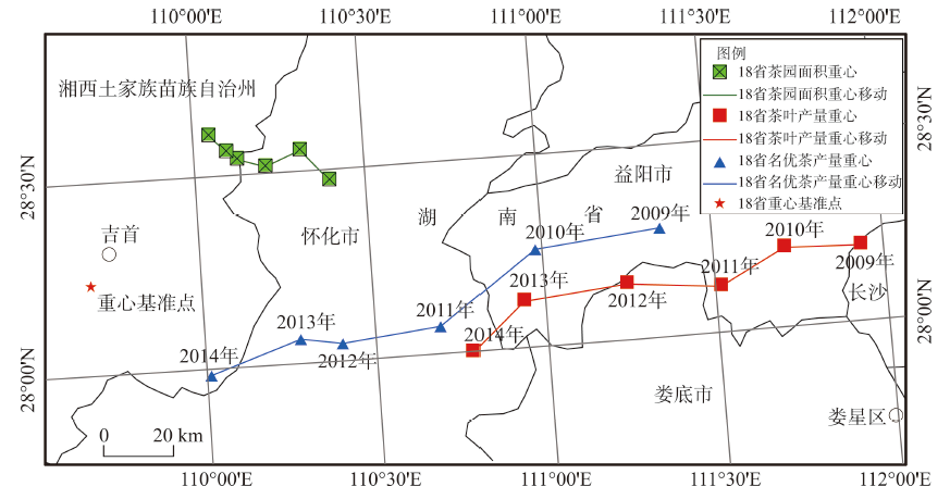 | 图7 2009-2014年中国茶园面积、茶叶产量与名优茶产量重心转移路径 |