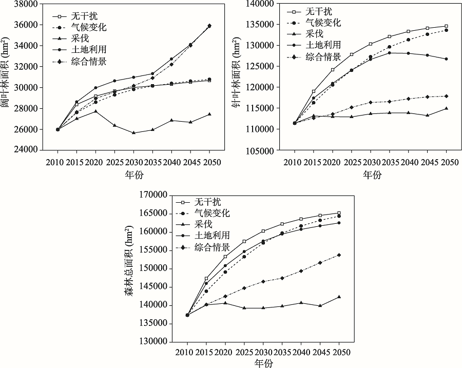 | 图3 2010-2050年不同干扰情景下阔叶林、针叶林和森林总体的面积变化 |
