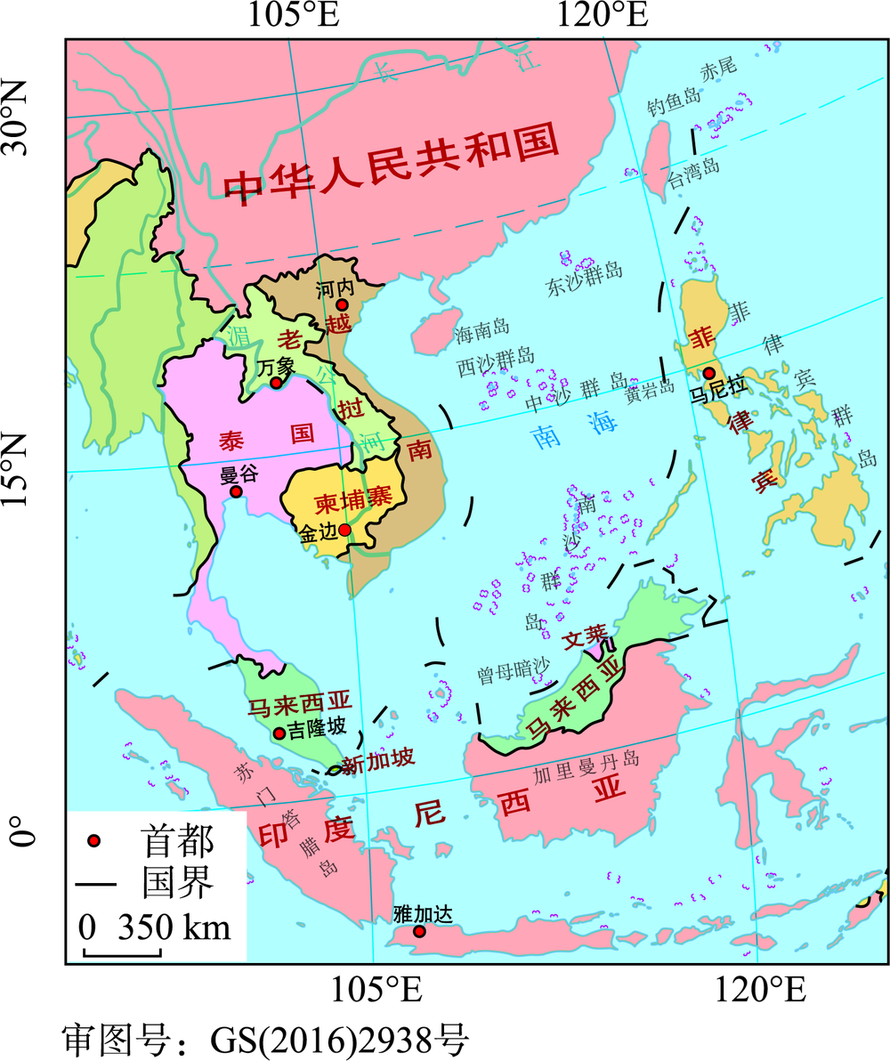 南海地处亚洲和大洋洲十字路口,连接太平洋和印度洋(图1),有时也被称为“亚洲地中海”(Morton et al, 2001)。南海周边分布着9个国家,分别为中国、越南、柬埔寨、泰国、马来西亚、新加坡、印度尼西亚、文莱和菲律宾,分别位于华南大陆、中南半岛、马来半岛和马来群岛。广阔的海域里散布着无数的岛屿、浅滩和珊瑚礁。