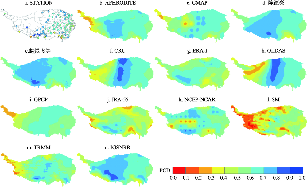 | Fig.2 Spatial pattern of the concentration degree (PCD) of monthly precipitation from 14 datasets on the Tibetan Plateau |