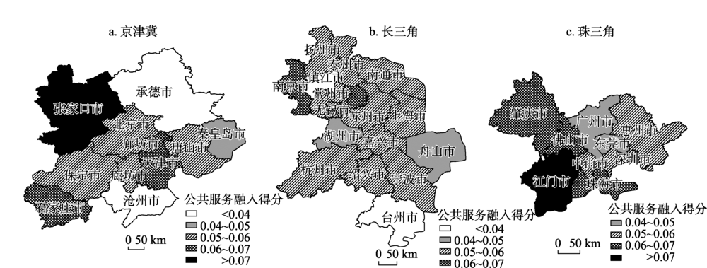 | 图5 京津冀、长三角和珠三角地区流动人口公共服务融入水平空间分异示意图 |