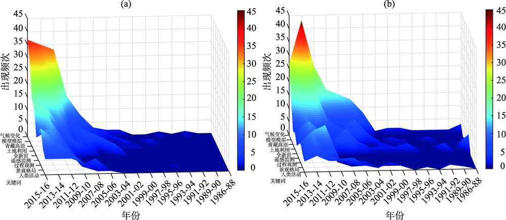 | Fig.1 Change of high-frequency keywords of physical geography projects of (a) the Young Scientist Fund and (b) the general projects of the National Natural Science Foundation of China |
