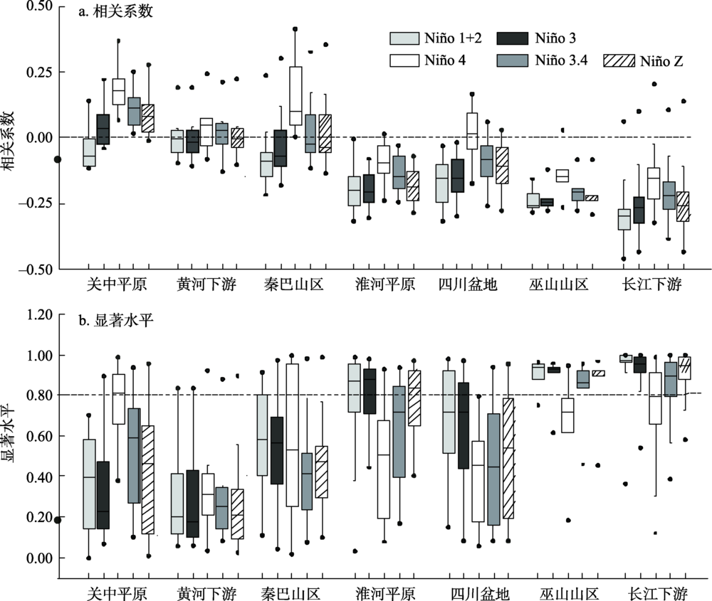 | Fig.5 Correlation analysis between oceanic Ni?o index of different sub-regions and heat waves at site scale in the Qinling-Huaihe region |