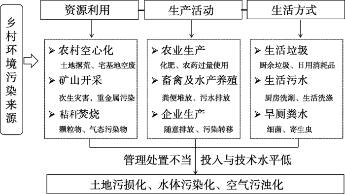 ... 中国乡村生态环境污染形势严峻,污染类型多样,总的特点为面源污染与点源污染并存,生活污染和生产污染叠加,工业与城市等外源性污染不断向乡村地区转移,而且乡村环境治理的资金投入与技术水平低下,严重威胁乡村的可持续发展(Chen et al, 2014; Norse et al, 2015).中国农村发展具有明显的地域特征差异,农村生态环境保护及资源可持续利用与经济发展水平脱节,总体来看,东部沿海地区和南部地区农村整体环境污染程度高于西部和北部地区.农业面源污染主要分布在以农作物种植为主的农村和以蔬菜瓜果生产为主的城市郊区,在空间上以华北和中部地区为核心,污染程度向外辐射递减,长江三角洲地区和东南沿海地区农业高度集约化发展,是高排放强度区(陈敏鹏等, 2006).畜禽养殖造成的水污染和空气污染,主要分布在城郊及乡镇附近的集中养殖区域,四川、河南和山东是畜禽养殖的污染防控重点省份(王军霞等, 2017).农村生活垃圾是所有农村人口聚集区的主要污染物,产生率呈现北方高于南方、东部高于西部的特点(韩智勇等, 2017).工业三废污染主要产生在经济发展较快的城郊和乡镇.乡村生态环境系统具有综合性和复杂性,本文通过对乡村污染来源、排放以及治理特点的综述,为乡村生态环境重构提供理论支撑. ...