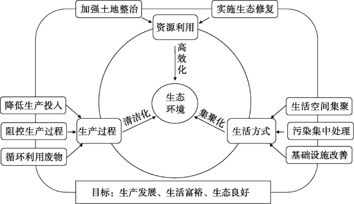 乡村生活空间的分散、生活方式的差异、污染排放的随机性以及基础设施的落后,阻碍了乡村生态环境的高效整治,需通过生活空间的集聚、生活污染的集中处理和基础设施的改善得到解决。根据空间优化、组织有序和产业高效的整治理念,促使乡村生活空间集聚,由“生活”功能转向“生活、生产、生态的多功能”(刘彦随等, 2009)。农村的空心化与宅基地的废弃化既是生活空间的问题,也是生态空间问题,还可间接导致生产空间问题。山东省禹城市通过迁村并居,退宅还田工程,将农田生态系统嵌入村庄绿地系统,实现了村庄整治增地和现代农业发展;通过空心村整治、中心村建设和中心镇转移的地域模式,通过合村并居,适当加强乡村聚落的空间集聚,使得群众的居住环境和生活环境得到明显改善(Liu et al, 2014; 龙花楼等, 2017)。针对乡村生活污水和垃圾污染生态环境问题,可通过城乡一体化处理或就地集中处理模式来解决,在村落人口密度和经济水平较低的偏远农村,可采用分散式家庭处理模式(顾霖等, 2016; 韩智勇等, 2017)。在条件允许的部分村庄,逐步开展气代煤、电代煤的冬季取暖措施,改善冬季雾霾状况。将农村环境治理与美丽乡村及异地扶贫搬迁等工程相结合,实现新农村基础设施的改善,乡村居民的集中生活,村容村貌的治理。促使乡村走生产发展、生活富裕、生态良好的文明发展道路,为人民创造良好生产生活环境,为生态安全作出贡献。