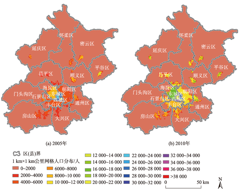 Fig. 2 Spatial distribution of population in Beijing in 2005 and 2010