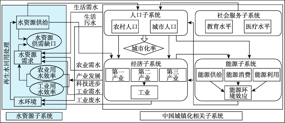 | Fig. 1 Relationship among water resource subsystem and subsystems of original China's urbanization SD model |