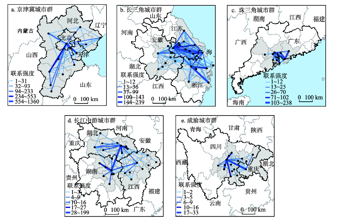 | Fig. 2 Spatial pattern of inter-city technological knowledge networks at regional geographical scales in five major urban agglomerations of China in 2014 |