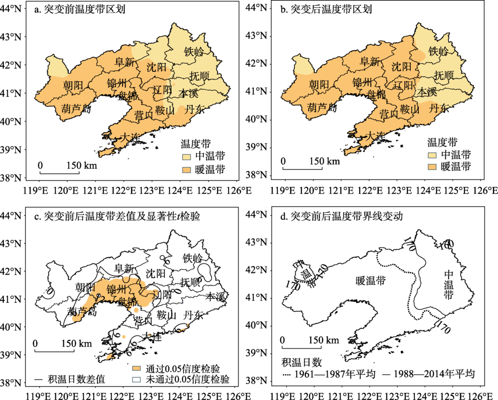 | 图4 1961—2014年突变前后辽宁省温度带区划、差值显著性t检验以及温度带界线变动 |