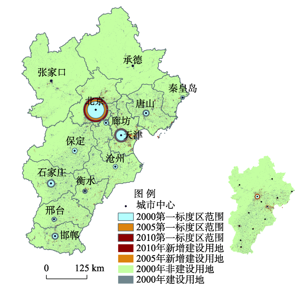 | 图4 京津冀各城市第一标度区范围图示 注:左图为示意图,图中的标度区范围是实际范围的2倍,右下角的小图为实际图 |