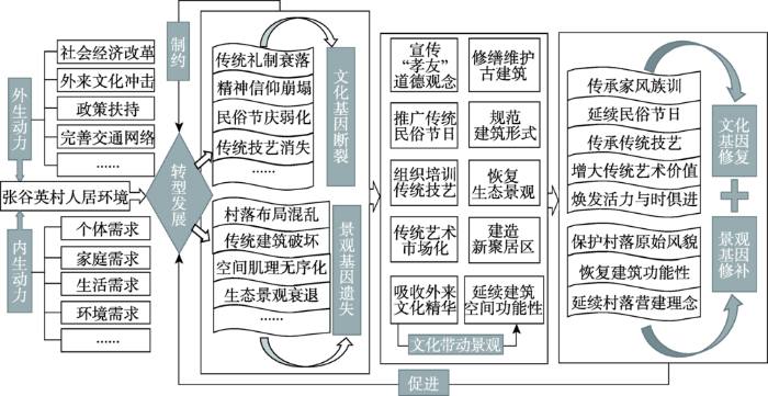 自张谷英建村以来,传统儒家文化的痕迹就烙印在村落的方方面面,在漫长的发展历史中,张谷英村形成了以当大门、王家塅和上新屋为核心建筑群的“龙形”景观格局,也形成了包含礼制思想、生态理念、道德规范、礼仪习俗等在内的一套完整的传统文化理念。改革开放之后,国家经济政策和基层组织结构的调整使村民的能动性和积极性得到了极大释放,旅游业成为驱动村落发展的新动力,张谷英村进入了大规模的旅游开发和乡村建设时代。尽管传统村落人居环境系统是一个开放的巨系统,但受根深蒂固的宗法礼制和传统的内生型发展模式影响,张谷英村人居环境转型发展模式几经周折,最后依然选择了以村民为核心主体的自下而上的自组织模式(李伯华, 曾荣倩等, 2018)。在自组织模式影响下,村民人居环境建设行为呈现出一定的规律性,即与村民个体利益关联性越强、参与程度越强的非物质文化修复效果较好。具体表现为在张谷英村人居环境转型发展过程中,呈现出文化基因修复在先,景观基因修补在后,文化基因修复带动景观基因修补的发展逻辑关系(图3)。