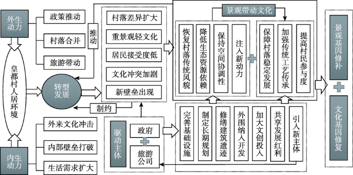 传统村落人居环境系统的稳定性表现为一种动态平衡,转型发展过程中,系统内部各元素之间不断进行着适应与耦合,不协调的人居环境转型往往会导致系统内部各元素无法及时适应与更新,造成景观基因和文化基因的紊乱、断层。1995年,通道县政府将头寨、尾寨、新寨、盘寨4个侗族村寨进行合并,组建皇都侗文化村,将其作为民俗景点开发经营。旅游业的快速发展一方面带来了社会、经济、产业等一系列变革,为村落生产、生活水平的提升注入了活力,加快了皇都村人居环境转型发展的进程;另一方面,随着外部主体介入的力度持续升级,皇都村人居环境转型发展的内生力量在外部力量的冲击下不断弱化,仅靠自组织力量难以继续保持村落人居环境系统的稳态发展,村落景观基因和文化基因的保护传承面临着巨大的挑战,亟需外部力量的协调和调控。基于此,皇都村人居环境建设结束了数百年的村民自组织发展模式,正式进入了由政府主导的他组织发展时代。受适应主体自身能力和角度的影响,在他组织模式下,皇都村人居环境转型发展呈现景观基因修补在先,文化基因修复在后,景观基因修补带动文化基因修复的发展逻辑关系(图4)。不同于张谷英村人居环境渐进式的转型发展措施,他组织模式下,皇都村人居环境转型发展在各阶段均具有明显的结构性,适应主体在各阶段通过提供转型发展动力、修正转型发展轨道、修补转型发展缺陷等3个方面对皇都村的人居环境转型施加影响和控制。