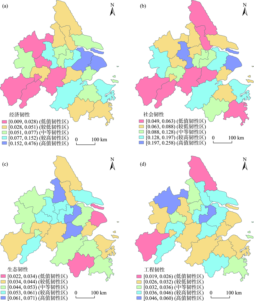| Fig.2 Spatial distribution of urban resilience dimension values |