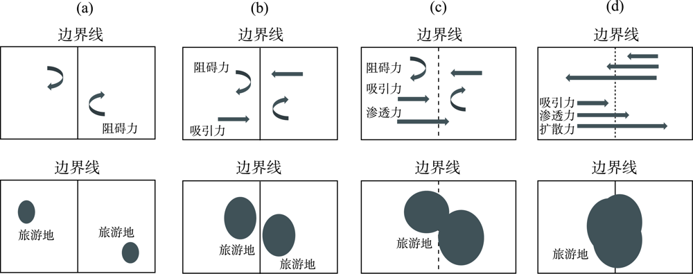 | 图1 边界与旅游流、旅游地的空间关系 注:边界线越虚,表示边界的渗透性越强,旅游流的箭头表示主要的流动方向。 |