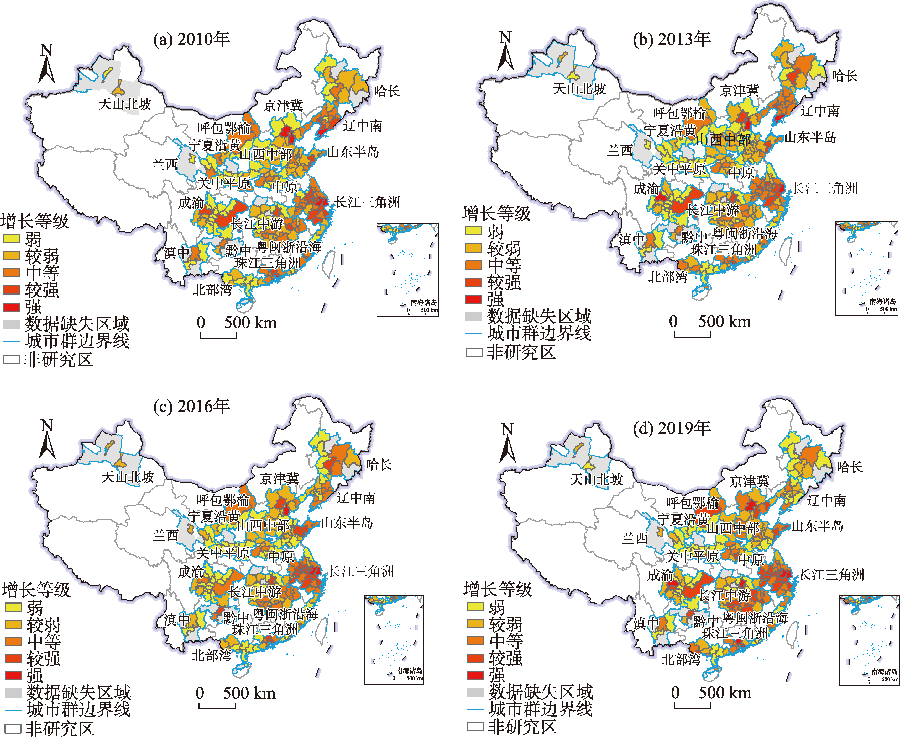 | 图2 城市群内国际贸易增长时空演化 注:本图基于自然资源部标准地图服务网站下载的审图号为GS(2019)1825号的标准地图制作,底图无修改。 |
