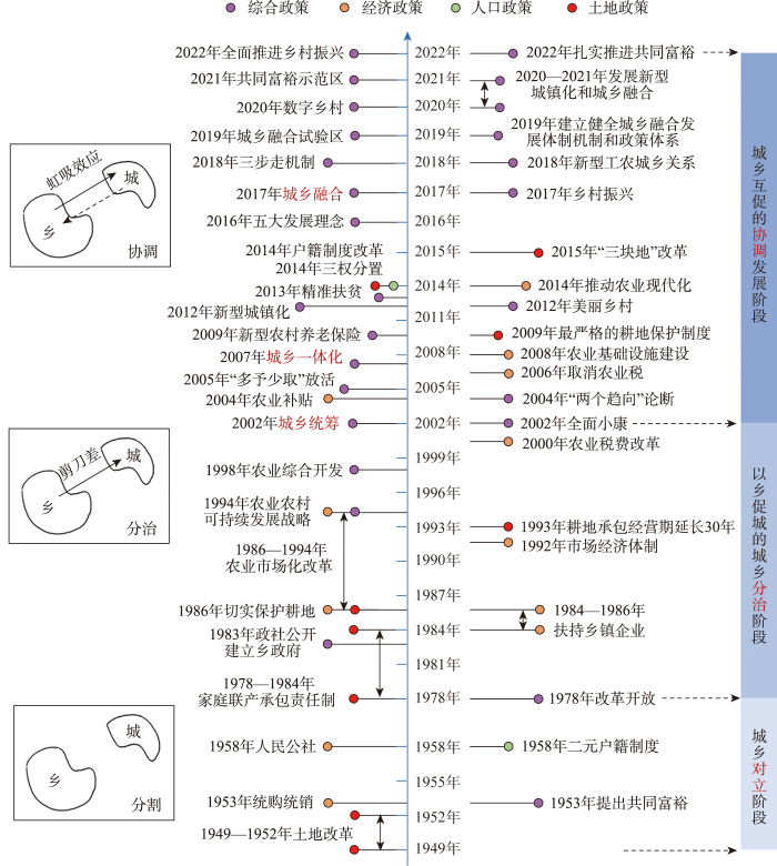 城乡融合本质上是城乡关系转型的一个阶段[1],指在城乡地域系统内,基于资源要素的自由流动与优化配置,推动城乡经济、人口、空间、社会和生态等多维融合,实现城乡居民生活质量和公共服务等值,从而形成城乡有机协调、功能互补、利益共享的复合系统[2⇓⇓-5]。梳理中国城乡关系及其政策演化发现(图1),1949年以来,人民公社、城乡二元户籍等政策使城乡生产要素流动受到严格限制,城乡对立关系逐渐形成,计划经济体制得以巩固。改革开放以来,以联产承包责任制和社会主义市场经济体制为基础,中国工业化和城镇化迅速推进,偏向城市的发展模式逐渐形成,农村剩余劳动力不断流入城市,支撑城市优先发展,造成城乡产品“剪刀差”,城市和农村之间的互反关系日益凸显[6],城乡差距不断扩大,城市环境污染、农村空心化、城乡土地配置失衡等问题已成常态[7],城乡处于“以乡促城”的分治阶段。21世纪以来,为破除不合理的城乡二元结构,中国相继构建了城乡统筹、城乡一体化和城乡融合等新型城乡关系目标定位,城乡交通网及信息网不断完善,城乡要素双向流动以及产业互动开始显现,城乡居民的收入消费差距逐步缩小,城乡公共服务及基础设施的不均衡配置得以改善,城乡步入协调发展阶段。