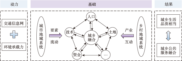 基于中国“城乡对立➝城乡分治➝城乡协调”的城乡发展阶段及政策演变,城市与乡村之间的平等互动关系成为必然诉求,乡村呈现“生产型➝消费型➝多功能型”转型态势[33]。中国城乡融合发展是在新型城乡关系目标定位构建的基础上,通过相应政策的制定引导城乡高质量发展。借鉴已有研究成果[24,34],本文构建城乡融合“基础—动力—结果”过程性框架(图2)。城乡融合实现的基础是城乡人口、土地、资本、技术等生产要素的自由流动和产业部门的空间互动[24],农村生产力和经济发展水平滞后是城乡对立格局的根源,乡村振兴等政策的有效落实进一步推动人才返乡、资金回流、产业对接以及智力回哺等[3],即通过劳动力、资本、技术等要素反哺农村,提升农村生产效率和生活质量,扭转农业弱质低效局面,缩小城市现代工业与农村传统农业2大部门生产率的差距。城乡融合的发展动力是交通信息网络完善和环境承载力提升,实现城乡要素的自由流动需要依托城乡交通和信息网络建设,且其流动的程度取决于环境承载能力[34],基础设施完善及环境承载力提升能有效缓解城市发展空间受限、生态环境恶化等现实困境,为城乡要素自由流动和产业互动融合提供了通道。城乡融合的结果表现为城乡生活品质和公共服务的融合,强调在城乡地域系统共生语境下居民生活质量和公共服务水平的“不同类但等值”[32],城乡居民生活品质包括城乡收入和消费2个方面,即缩小传统农业部门与现代工业部门的报酬率差距、城乡居民消费水平及消费结构性差异;城乡公共服务融合体现为城乡教育、医疗、社会保障等基本公共服务水平差异得到缓解,农村居民与城市居民共同享有各项社会福利。