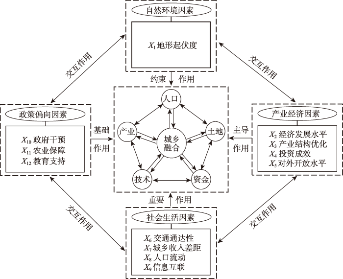 城乡融合是资源禀赋、经济社会、区域政策等多因素综合作用的结果。通过文献梳理,从自然环境、产业经济、社会生活、政策偏向4个维度12个指标探测城乡融合的核心解释变量(图3):