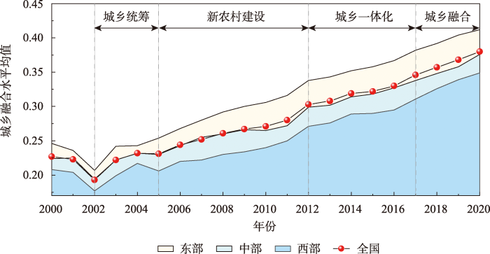 城乡融合是指导中国城乡转型的全新思路,探究城乡融合的时空特征及驱动机制是突破农村发展不充分、城乡发展不平衡等现实困境的迫切需要。论文基于“基础—动力—结果”过程性框架,构建了城乡融合评价指标体系,利用改进熵值法评价模型、kernel密度估计和地理探测器模型,测度2000—2020年中国的城乡融合水平,探究城乡融合水平时空分异及其驱动因素异质性演变。结果表明:① 中国城乡融合水平整体较低,呈先降后升的“√”型演变趋势,空间差异趋于缩小。② 以“胡焕庸线”为界,中国城乡融合水平呈现“东高西低”的空间格局;高值区中心极化特征突出,呈“带状”聚集趋势;中等水平区“集群化”特征有所减弱,且呈现由东部向中西部蔓延的趋势;低值区团簇于西部地区,其数量趋于减少。③ 全国尺度城乡融合水平的核心因素为人口流动、经济发展水平、城乡收入差距和教育支持,潜力因素为产业结构优化和对外开放水平,投资成效和政府干预“阈值”效应显著;区域尺度城乡融合水平的核心因素空间异质性明显,2020年东部地区为经济发展水平、投资成效、政府干预等,中部地区为投资成效、对外开放水平、城乡收入差距等,西部地区为教育支持、政府干预、产业结构优化等;各驱动因素交互作用对城乡融合水平的影响程度远超单因素,交通通达性与其他社会经济因素的交互作用显著增强。中国城乡融合时空演化及机理研究可为乡村振兴以及城乡高质量发展提供理论依据。