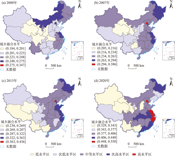 基于Jenks自然断裂法,分别将2000、2007、2013、2020年中国城乡融合水平分为低水平区、次低水平区、中等水平区,次高水平区和高水平区5个等级(图6),以“胡焕庸线”为界,中国城乡融合水平呈现“东高西低”的空间格局,表现出“东部稳步增长、中西部逐步崛起”的特征,其具体演化特征为: